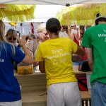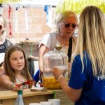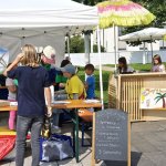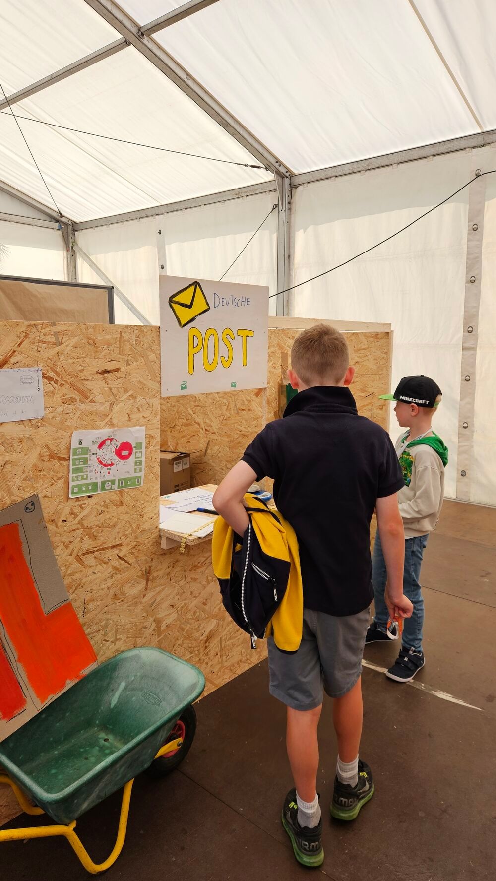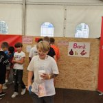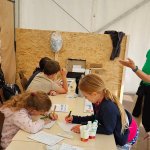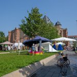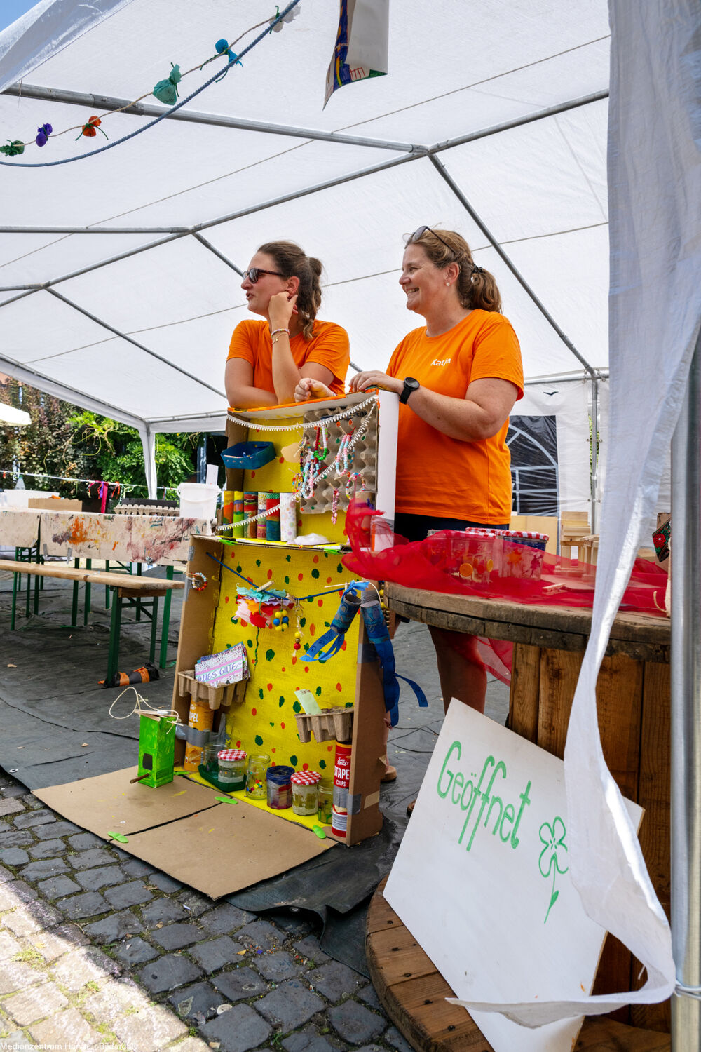 Wir nutzen für die „Betriebe“ die Räumlichkeiten in der Ruine, mehrere Zelte auf dem Platz um die Wallonische Ruine und Pavillons. Sonnenschirme und -segel sowie einige kleine Bäume auf den Wiesen sorgen auch für Schatten. Zwischendurch halten sich die Kinder immer wieder draußen auf.